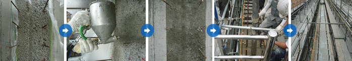 旧コンクリート表面に吹きつけ又はコテ塗りし、新コンクリートを打設することで新旧界面における接着性と水密性が向上します。